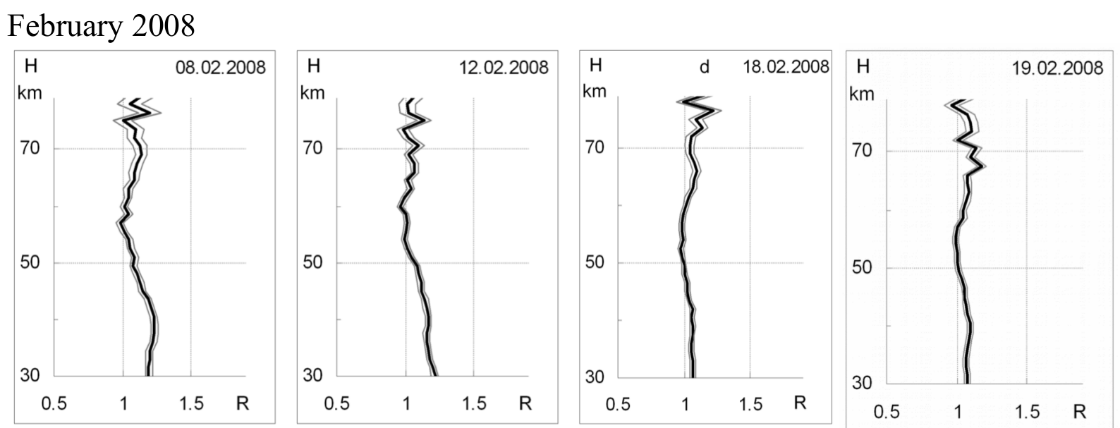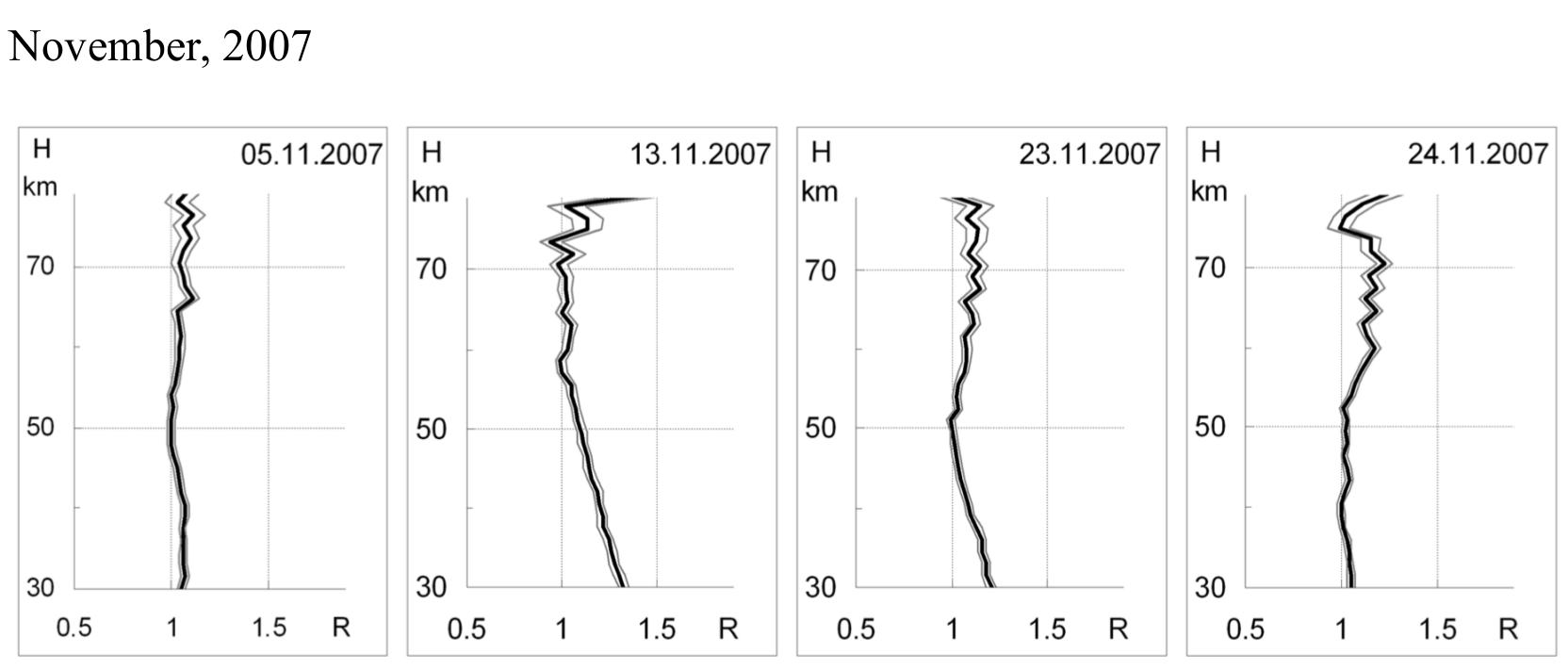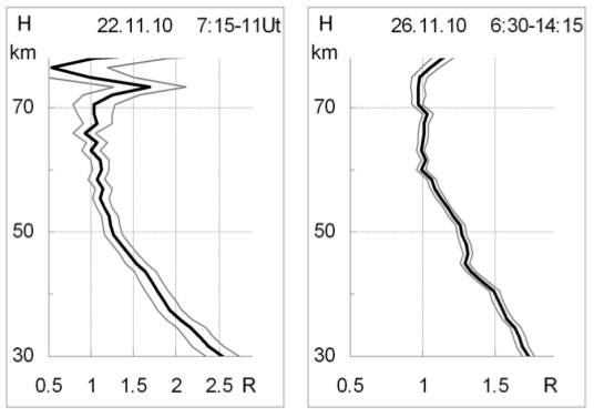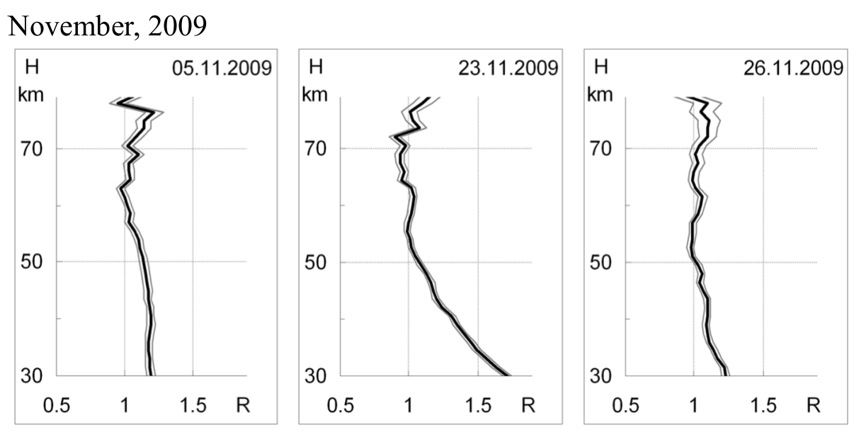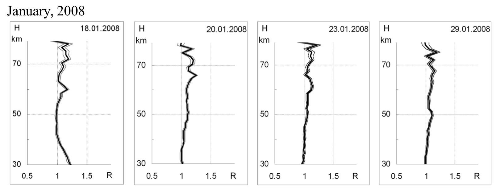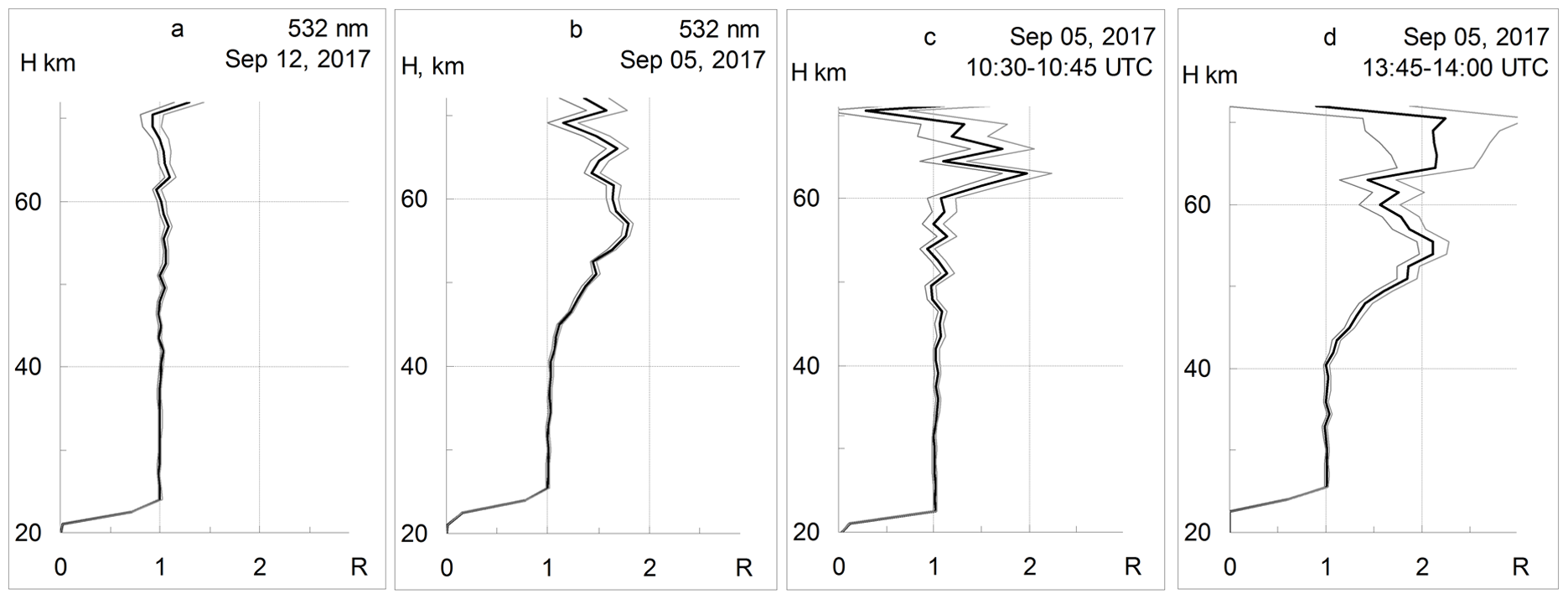 Используя модель упругого однократного рассеяния света, из данных эхосигналов выполняется восстановление профиля отношения рассения R(H) в стратосфере и мезосфере. В качестве базовой модели атмосферы используется NRLMSISE-00. Коэффициент отношения рассеяния определяется как отношение аэрозольного и молекулярного рассения к величине последнего. На рис. 1 представлены примеры обработки лидарных сигналов.