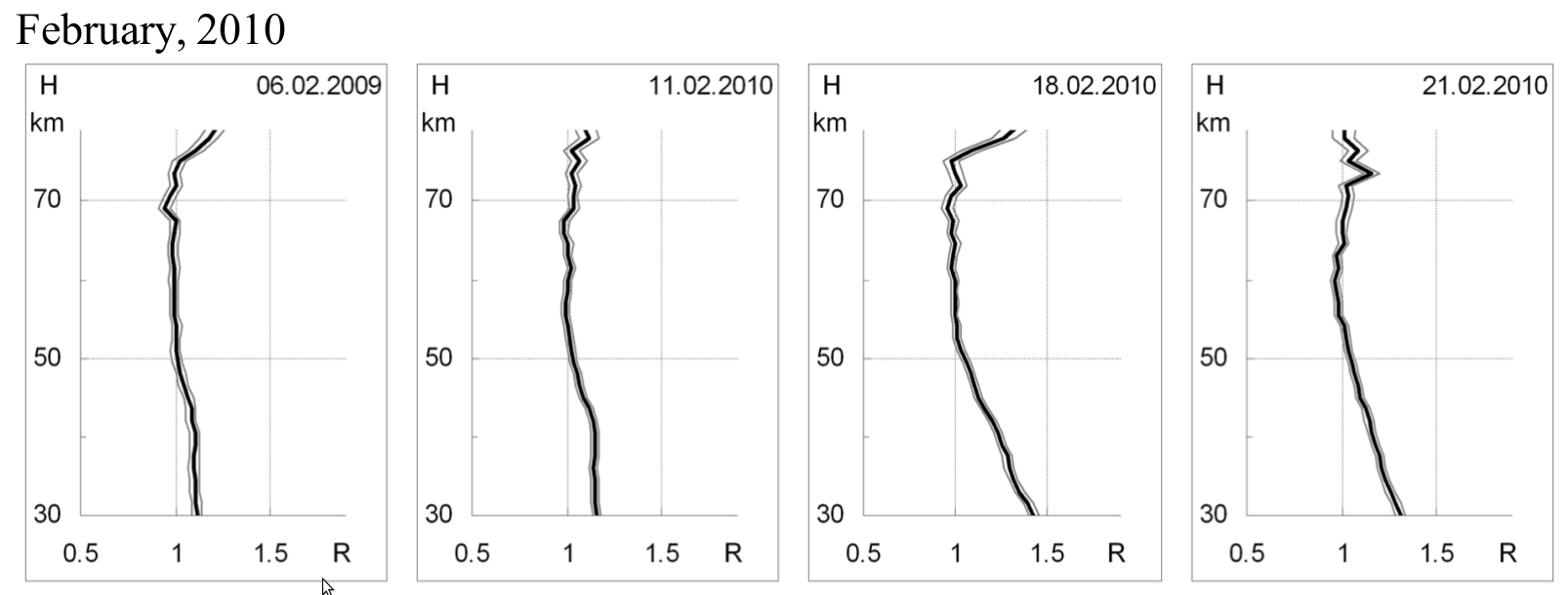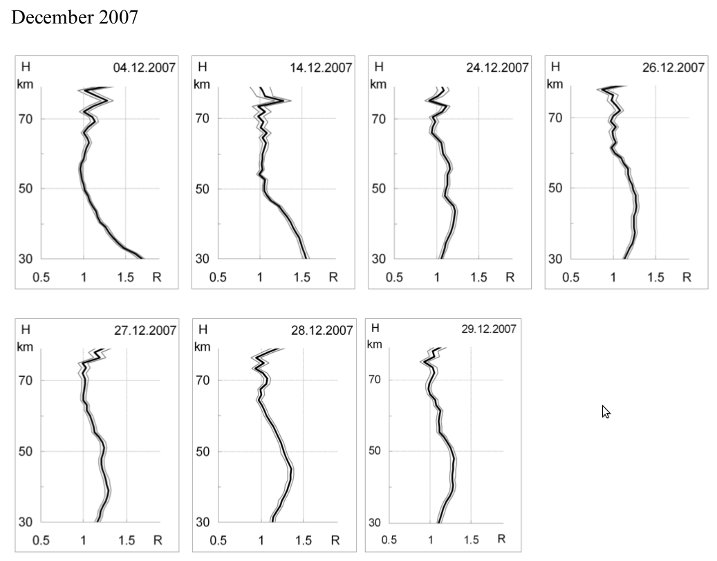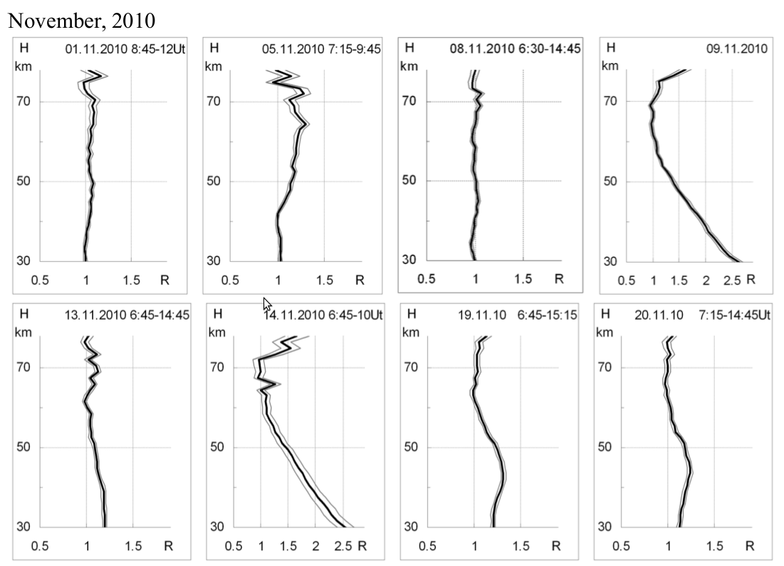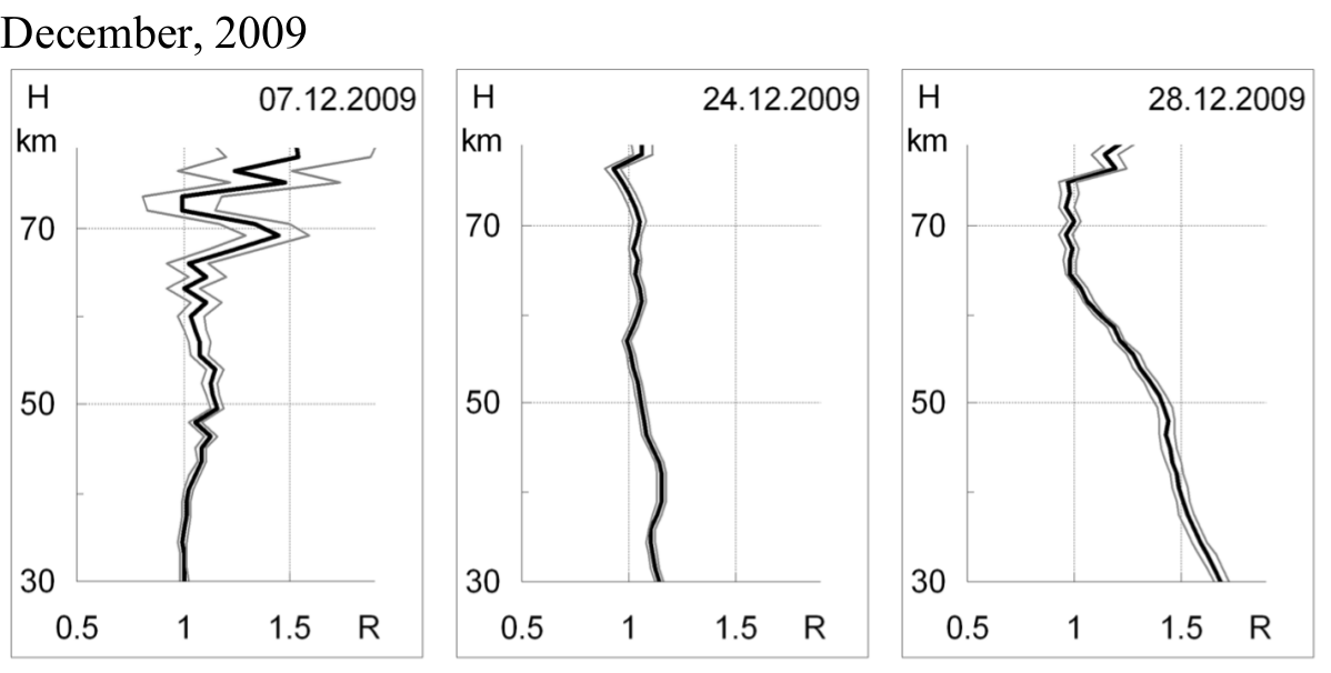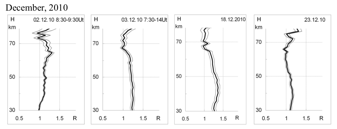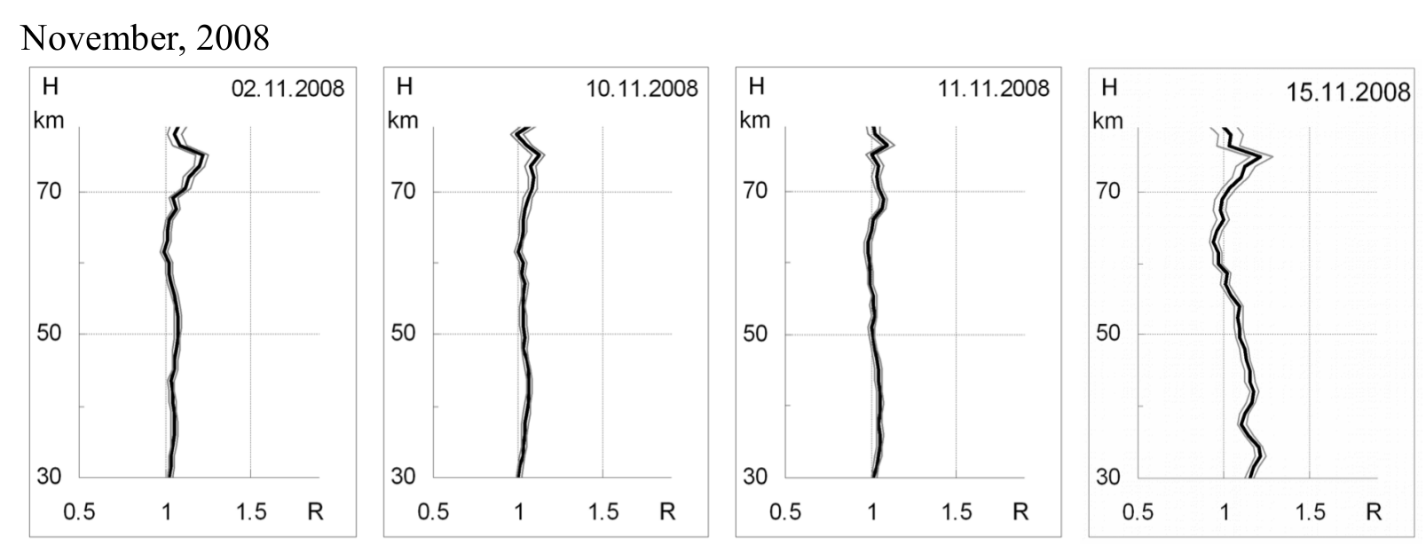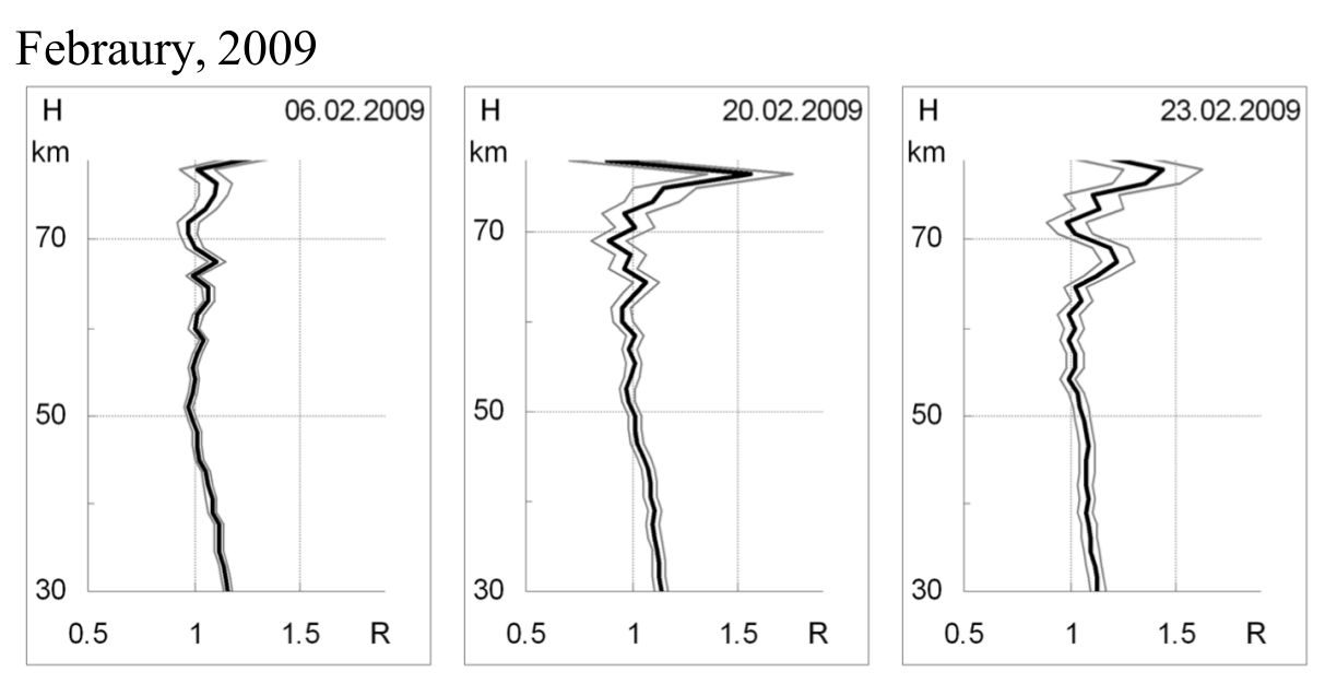 Используя модель упругого однократного рассеяния света, из данных эхосигналов выполняется восстановление профиля отношения рассения R(H) в стратосфере и мезосфере. В качестве базовой модели атмосферы используется NRLMSISE-00. Коэффициент отношения рассеяния определяется как отношение аэрозольного и молекулярного рассения к величине последнего. На рис. 1 представлены примеры обработки лидарных сигналов.