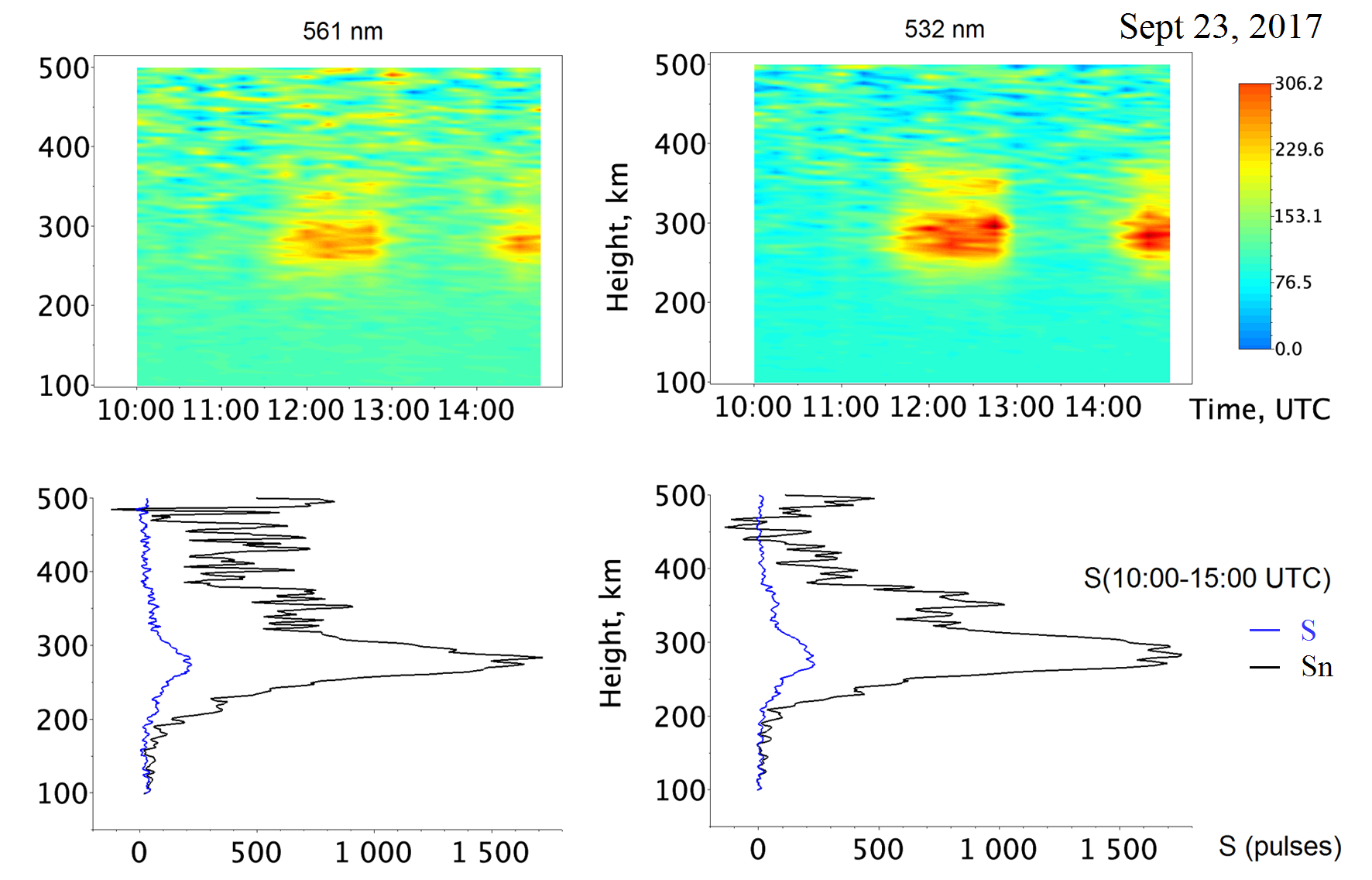 Наибольших интерес представляют данные, полученные в интервале высот от 100 до 500 км. Наблюдения в термосфере выполены с помощью двухчастного зондирования. Резонансные линии ионизованных атомов кислорода и азота позволяют в режиме счета фотонов с учетом геометрического фактора ослабления сигнала позволяют получать информацию о состоянии ионосферы во время высыпания заряженных частиц. На рисунке 2 представлены результаты двухчастотного зондирования.